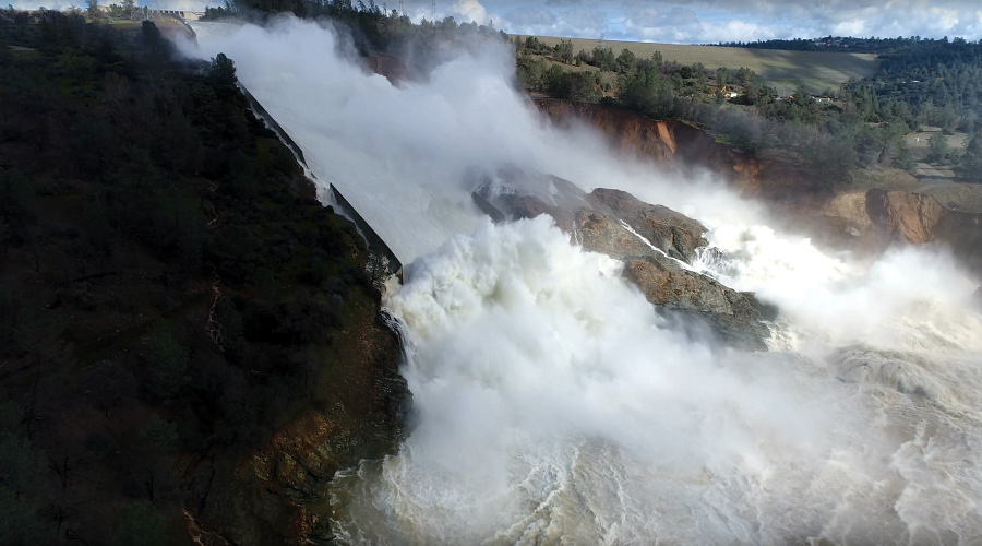 Tens of thousands of people have been fleeing California towns downstream from the Oroville Dam after fears of an imminent collapse of its spillway prompted an evacuation order. Authorities are seeking to stem the breach with the help of helicopters.