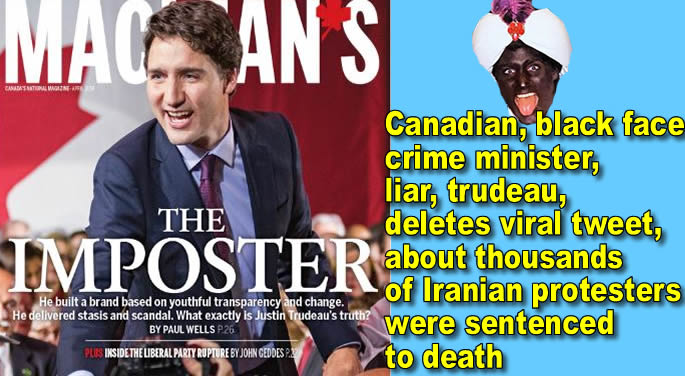 Canadian, black face, crime minister, liar trudeau, deletes viral tweet, about thousands of Iranian protesters were sentenced to death