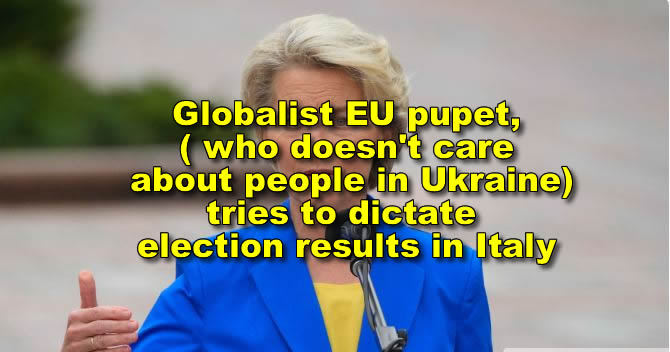September 23, 2022 by RushHourNews - 0 comments Globalist Ursula von der Leyen of the EU threatens Italy after polls show right-wing coalition leading